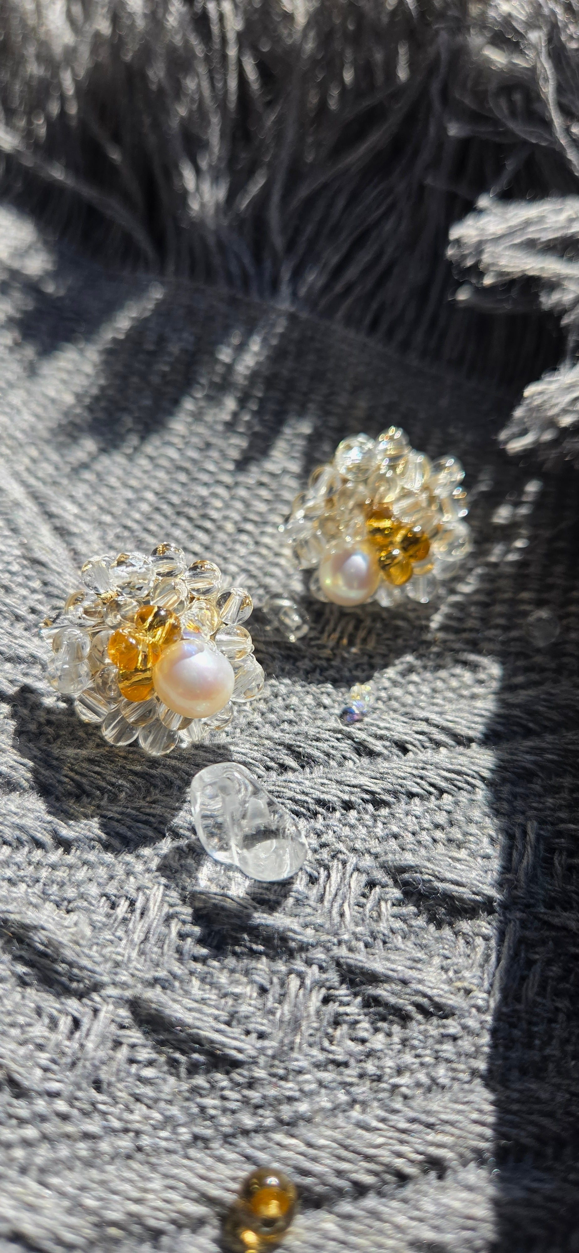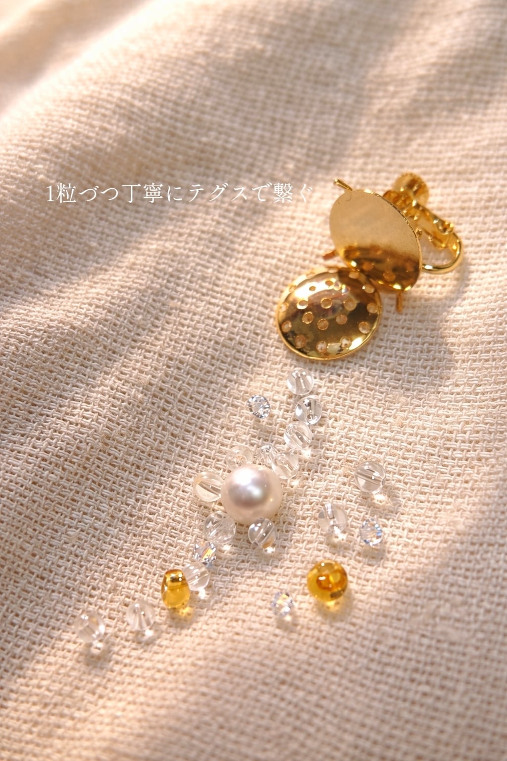 透明感あふれる水晶ビーズに、やさしく輝くパールを添えた繊細で上品なイヤリング。